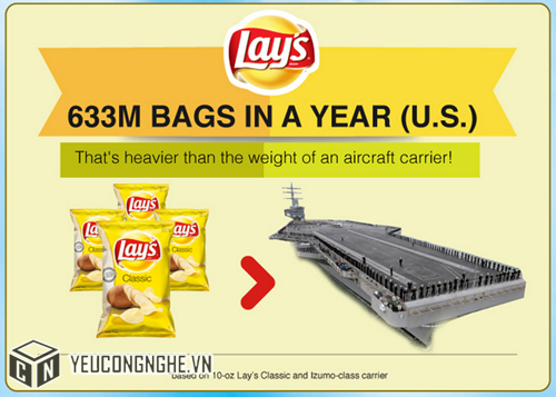 Khoảng 633 triệu gói sản phẩm Lay's được tiêu thụ một năm ở Mỹ. Khối lượng của nó tương đương với một chiếc tàu sân bay.