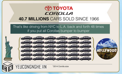 Ước tính có khoảng 40,7 triệu chiếc xe Toyota Corolla đã được bán ra kể từ năm 1966. Nếu xếp những chiếc xe này liên tiếp nhau, độ dài tương đương với việc bạn đi rồi lại về từ New York đến Los Angeles 48 lần.