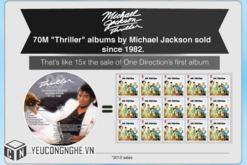 Album 'Thriller' của Michael Jackson đã bán được 70 triệu bản từ năm 1982. Con số này gấp 15 lần lượng bán được của album đầu tay của nhóm nhạc nổi tiếng One Direction.