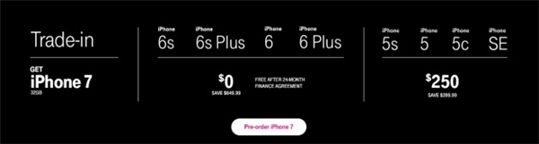 Nếu đổi từ các đời iPhone 6, 6 Plus, 6s, 6s Plus lên iPhone 7 32 GB, bạn sẽ được đổi hoàn toàn miễn phí và sẽ tiết kiệm tới 650 USD (14,3 triệu đồng) nhưng sẽ phải kí hợp đồng sử dụng 2 năm với T-Mobile. Tương tự, nếu đổi sang iPhone 7 Plus 32 GB, bạn sẽ cần trả thêm 120 USD (2,6 triệu đồng) và tùy ý sử dụng nhà mạng.