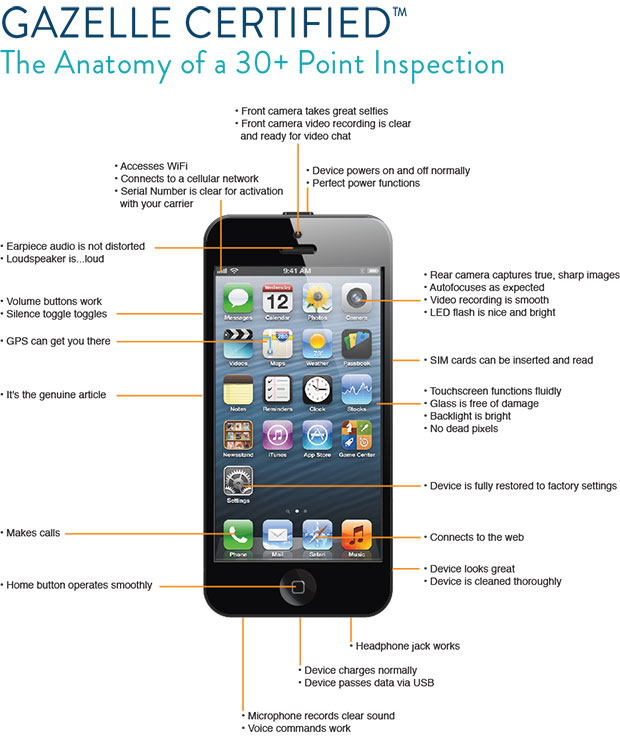 Những chiếc iPhone trước khi được bán cho người dùng đều phải trải qua một quá trình kiểm tra khắt khe với hơn 30 bước kiểm tra khác nhau. Màn hình được kiểm tra để chắc chắn rằng nó không có quá nhiều vết trầy xước, camera, microphone và pin cũng được kiểm tra cẩn thận nhằm đảm bảo chúng không gặp vấn đề gì quá nghiêm trọng (đặc biệt là pin). Thiết bị cũng được Gazelle xóa dữ liệu và khôi phục cài đặt gốc (factory reset) trước khi đến tay người dùng.