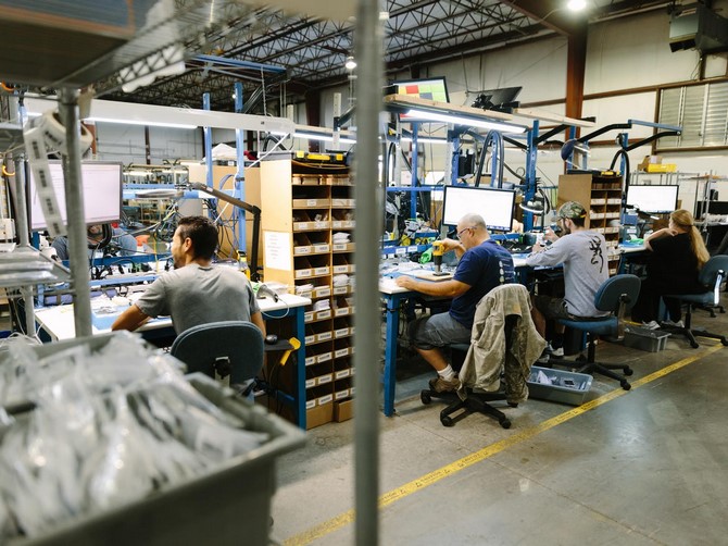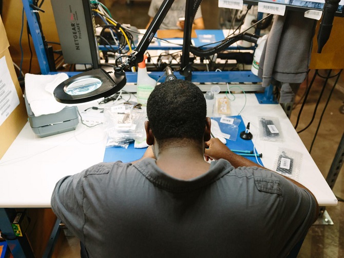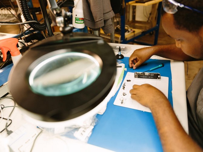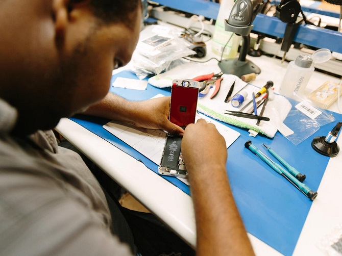 Một nhóm người đang thực hiện sửa chữa những chiếc iPhone cũ bị hư hỏng