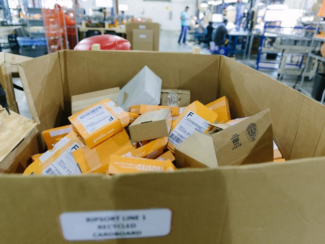 Một công nhân đang sắp xếp những chiếc hộp chứa iPhone cũ do người dùng gửi đến tại nhà máy của Gazelle