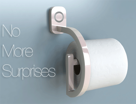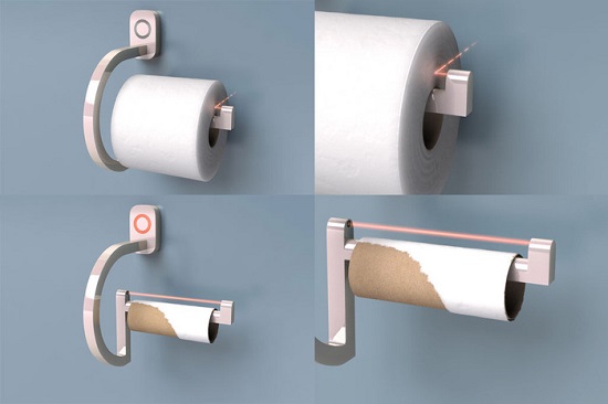 Thiết bị này là một giá treo giấy vệ sinh nhưng được thiết kế khá đẹp và hiện đại, có thể dễ dàng lắp đặt trong toilet thay cho những giá vệ sinh khác. Nó sử dụng pin để hoạt động và bạn chỉ cần treo giấy vệ sinh của mình trên đó, khi cảm biến hồng ngoại trên thiết bị phát hiện rằng giấy vệ sinh của bạn sắp hết thì nó sẽ cảnh báo bằng một bóng đèn màu đỏ nhấp nháy liên tục giúp bạn biết để nhanh chóng thay một cuộn giấy mới.