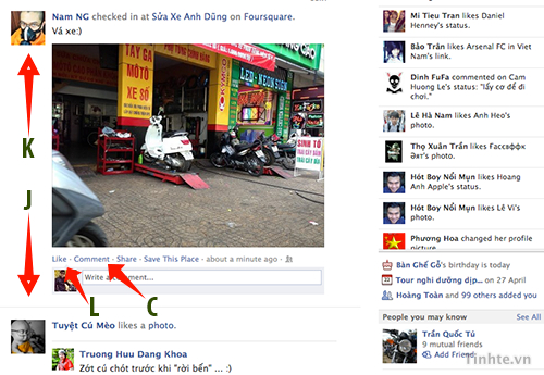 Khi dấu chọn đang ở một Status hay bức hình nào đó, bấm phím "L" để Like hoặc Unlike và phím "C" để Comment.