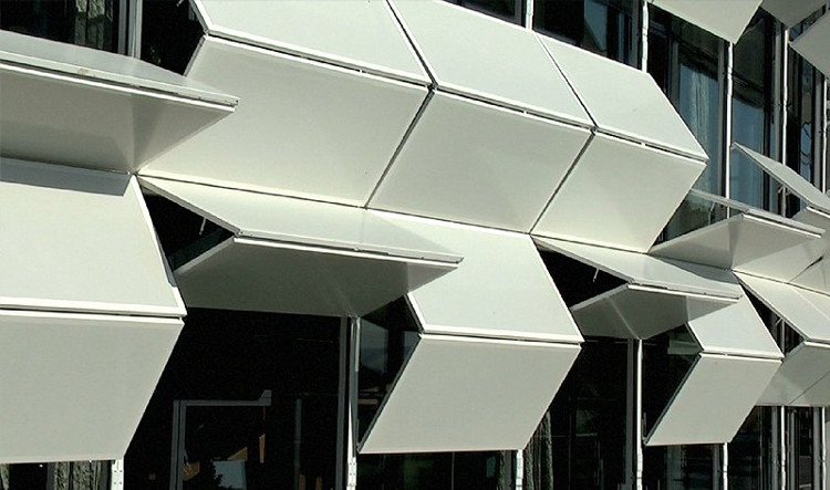 Lớp cửa sổ chắn bên ngoài này hoạt động nhờ vào các tấm nhôm tự động di chuyển.