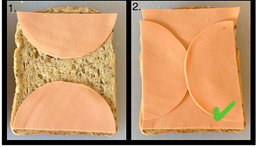 Miếng sandwich hình vuông và mẩu phô mai hình tròn làm khó bạn trong việc sắp xếp sao cho hợp lí. Đừng lo, cắt đôi miếng phô mai và đặt theo hình nhé, đảm bảo món sandwich sẽ ngon "từng mi li mét" cho xem.
