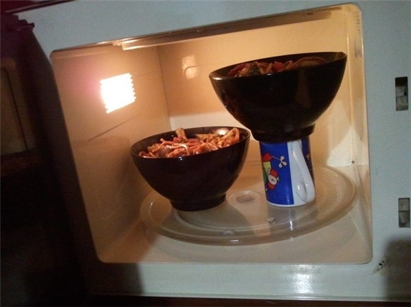 Bạn băn khoăn không biết làm sao bỏ vừa 2 tô thức ăn cùng một lúc trong lò vi sóng mà không muốn tốn thời gian hâm nóng từng cái một? Dùng một chiếc cốc nâng một tô lên sẽ giúp sắp xếp hợp lí không gian lò vi sóng.