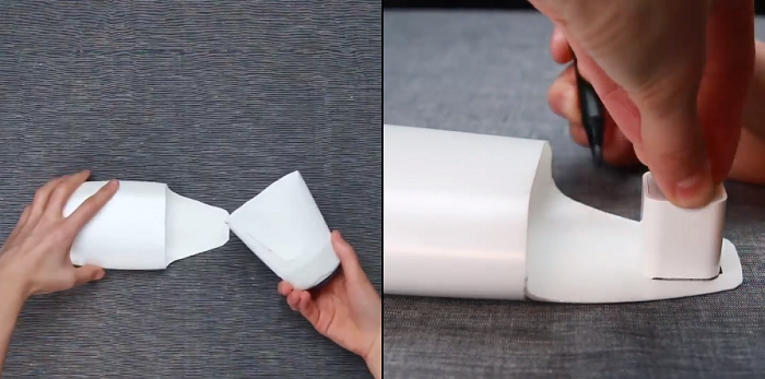 Bạn chọn một chai nhựa rỗng có độ rộng đủ lớn để chứa điện thoại của bạn. Sau đó, bạn vẽ trên chiếc chai theo hình giá đỡ điện thoại. Nhớ vẽ một ô vuông ngay chiếc vành để rọc.
