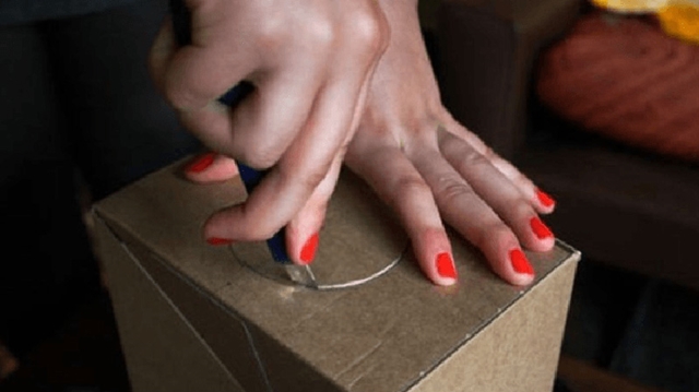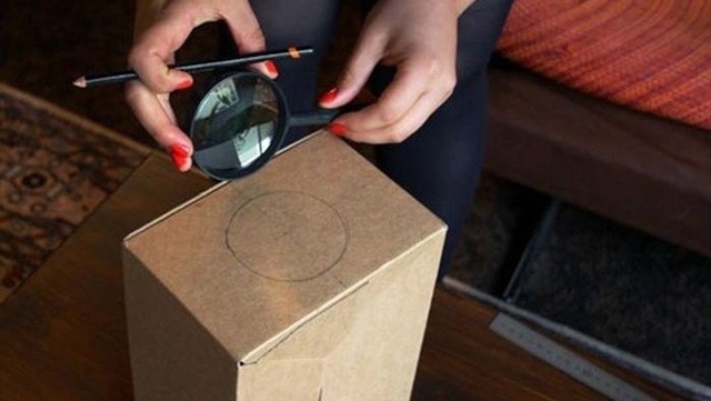 Đầu tiên bạn hãy tiến hành đặt kính lúp vào giữa 1 bên cạnh của hộp giấy, sau đó lấy bút chì vẽ lại vòng tròn kính để làm dấu.