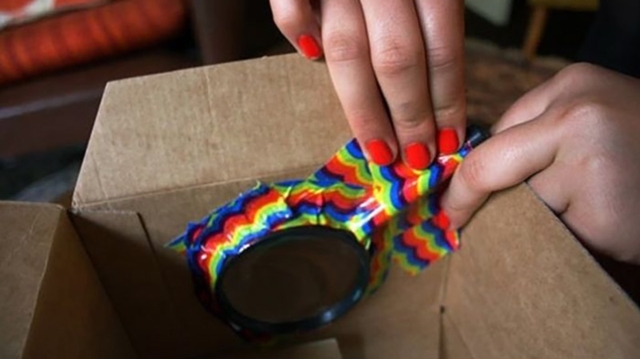 Khi đã rọc xong, bạn hãy mở hộp ra và đặt kính lúp vào vị trí lỗ ở bên trong, sau đó dùng băng dính để cố định lại. Lưu ý rằng bạn nên đặt mặt phóng to quay hướng ra ngoài để xuất hình ảnh ra ngoài. Trong quá trình cố định kính lúp bạn cũng nên đảm bảo rằng không chừa bất cứ khe sáng nào từ bên ngoài có thể lọt vào trong hộp.