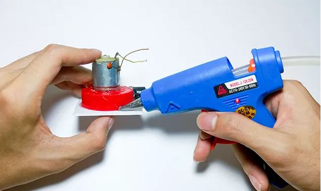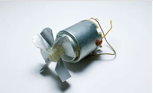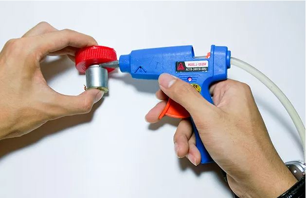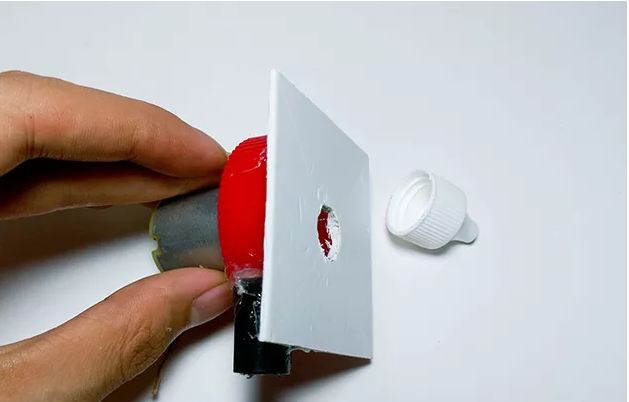 Các bạn đục 1 lỗ ở chính giữa nắp chai để gắn mô tơ lên nắp. Sau đó các bạn đặt mô tơ vào và dùng keo nến cố định mô tơ vào nắp chai.