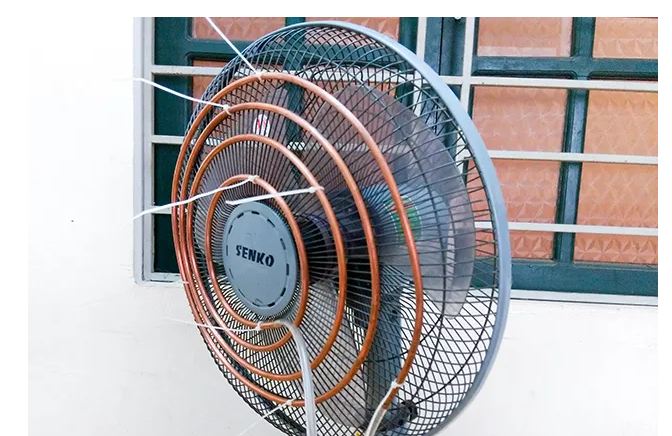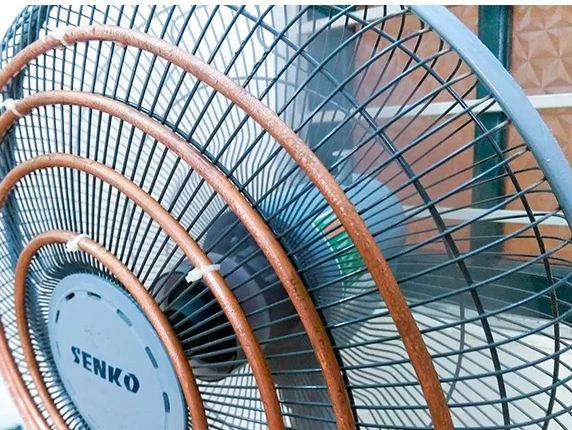 Các bạn quấn ống đồng thành các hình tròn đồng tâm rồi gắn nó lên quạt bằng dây rút như hình. Sau khi rút xong các bạn cắt bỏ dây thừa đi cho gọn. Cắt đoạn ống nhựa nhẻo PVC phi 6 thành hai đoạn dài khoảng 70 cm rồi nối vào hai đầu của ống đồng.