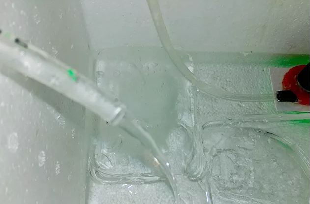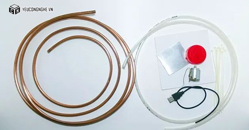 Các bạn cho đá và một chút nước vào hộp xốp sao cho nước đủ để chạy 1 vòng qua ống đồng về thùng xốp. Nối ống nhựa vào đầu nước ra của máy bơm và cắm đầu dây USB vào pin sạc dự phòng có thể dùng sạc điện thoại có cổng USB) để máy bơm hoạt động.