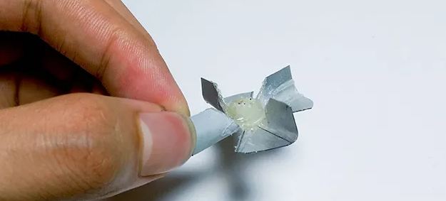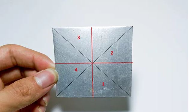 Dùng 1 miếng nhôm, chia làm 8 phần đều nhau như hình. sau đó cắt theo vạch đen và gấp theo vạch đỏ.