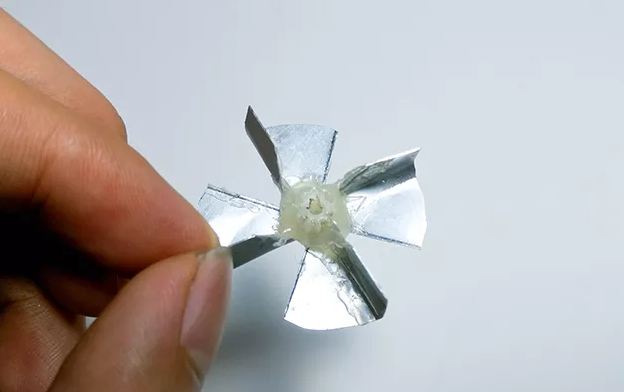 Tiếp theo các bạn đục 1 lỗ tại tâm đặt miếng bánh răng vào và dùng keo nến cố định vào cánh quạt.