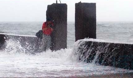 Bất chấp hiểm nguy từ những đợt sóng dữ tợn, nhiếp ảnh gia vẫn nép người bên đê chắn sóng để không bỏ lỡ cảnh tượng biển "nổi giận"