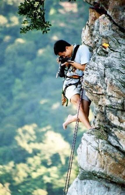 Treo người trên vách dựng đứng để chụp cảnh quan dưới chân núi là cách mà một nhiếp ảnh gia lựa chọn.