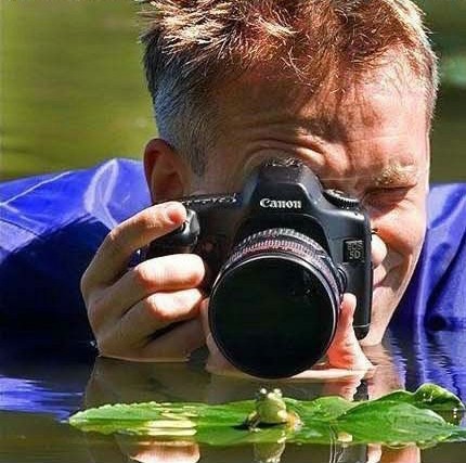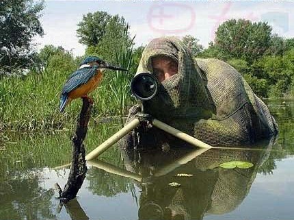 Một nhiếp ảnh gia trùm khăn kín đầu và ngâm có thể dưới hồ nước để tiếp cận "mẫu ảnh" ở cự ly gần nhất.
