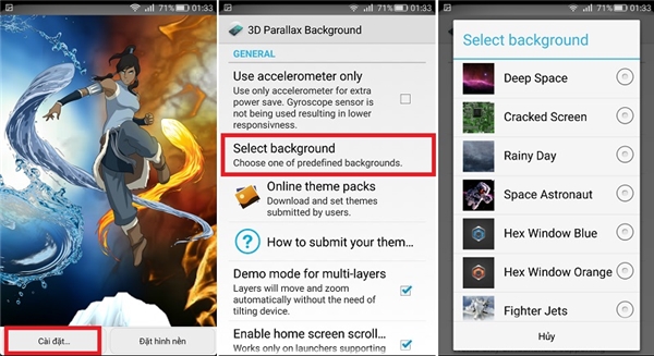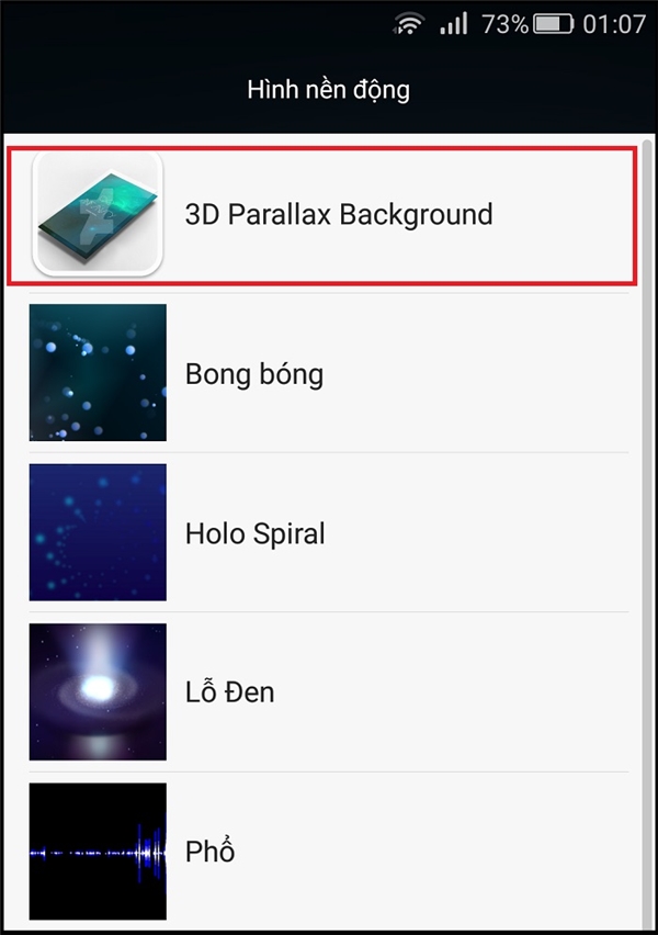 Sau khi cài đặt xong, bạn vào phần Hình nền động trên máy, sau đó chọn 3D Parallax Backgroud.