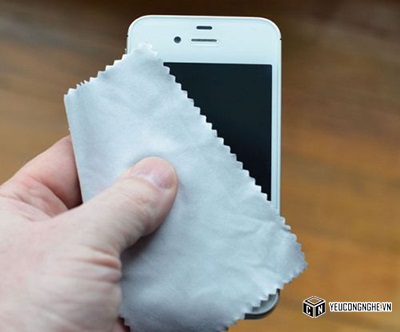 Thấm một chút nước sạch, hoặc nước có pha một hai giọt xà phòng để vệ sinh máy. Bạn nhớ chỉ đổ lên khăn, chứ không phun trực tiếp lên điện thoại nhé. Dùng một tấm vải khô khác để lau lại máy.