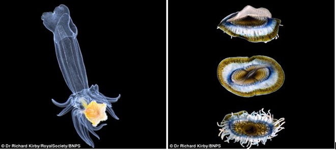 | Đây là hình ảnh của một ấu trung giun biển và một loài sứa có tên là Velella velella khi Richard phóng đại chúng gấp 10 lần dưới kính hiển vi. |