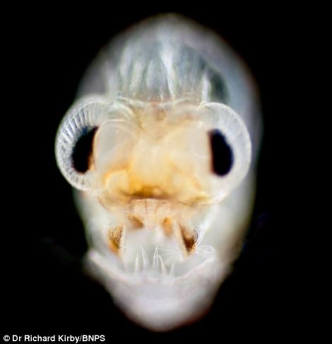 | Bộ mặt phóng to của một ấu trùng cua khiến nó giống một loài quái vật của đại dương. Nó có chiều dài tới 12 mm và thân hình trong suốt. |