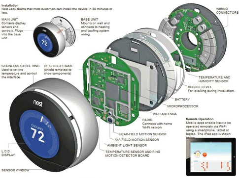 Từ hình ảnh trên, có thể bạn đã thấy rõ hầu hết các linh kiện bên trong chiếc Nest đều có hình khối chữ nhật/ vuông. Điều này khiến không gian bên trong thiết bị không được tận dụng hết và có rất nhiều phần thừa.