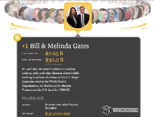 Với tổng số tiền quyên góp cho các hoạt động từ thiện lên tới 30,2 tỷ USD, hai vợ chồng tỷ phú Bill Gates dẫn đầu danh sách 50 người Mỹ làm từ thiện nhiều nhất của Forbes.