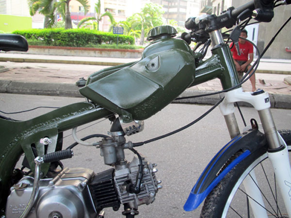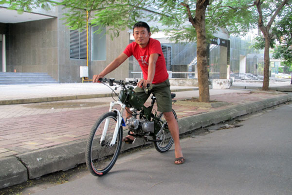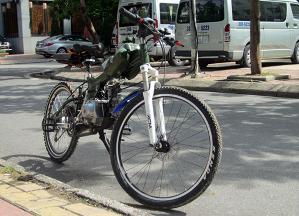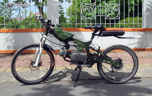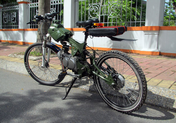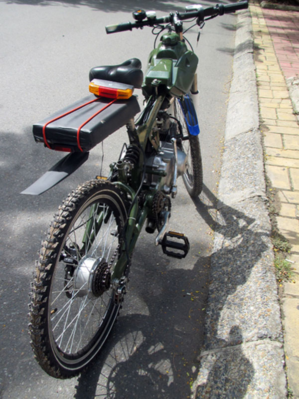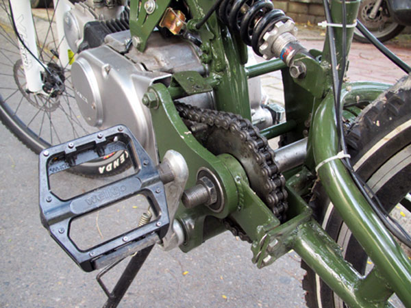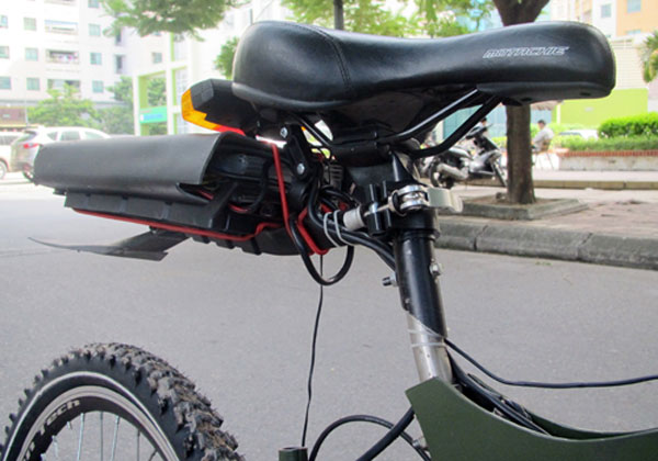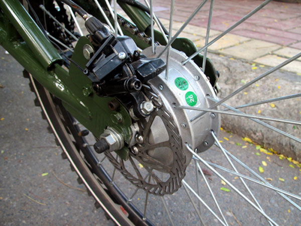 Mô-tơ điện gắn trực tiếp lên may-ơ bánh sau. Công suất 340 Watt khi vận hành độc lập giúp xe duy trì tốc độ chừng 20 km/h. Điện năng lấy từ cụm pin Lithium gắn sau yên. Anh Hoàng giải thích: "Thực tế có thể dùng ắc-quy loại thường nhưng kích thước sẽ rất lớn. Một nhược điểm khác của ắc-quy thường là thời gian nạp đầy lâu, kéo dài từ 6 đến 8 tiếng. Trong khi đó pin Lithium nhỏ gọn, thời gian nạp đầy chỉ khoảng 2 tiếng".