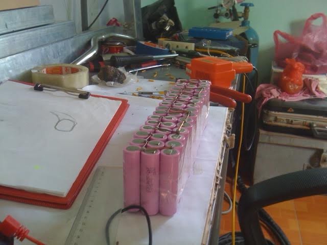 Cách bố trí các cell pin của anh Đông. Đây là loại pin 18650 26f do Samsung sản xuất, với giá khoảng 60.000 đồng/viên. Chiếc xe của anh Đông sử dụng tổ hợp 48 viên pin.