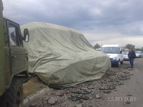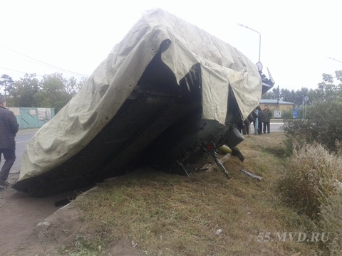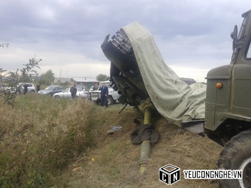 Pha ôm cua gấp với tốc độ cao khiến chiếc xe tăng trên rơ-mooc xe tải lật nhào xuống đường, các binh sỹ Nga được điều tới phủ bạt che chiếc xe tăng.