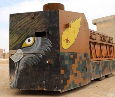 Nhóm dân quân người Kurd tự tạo ra những chiếc xe tăng từ phương tiện sẵn có. Lớp vỏ sắt giúp chúng hạn chế đáng kể hỏa lực từ vũ khí cá nhân của đối phương.