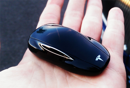 Khi mua một chiếc Tesla Model S sedan, khách hàng sẽ nhận xe và một phiên bản thu nhỏ của xe - thứ thực chất là chìa khóa. Chiếc chìa bóng bẩy, trơn tru và không có nút bấm. Cách thức sử dụng như ảnh dưới: