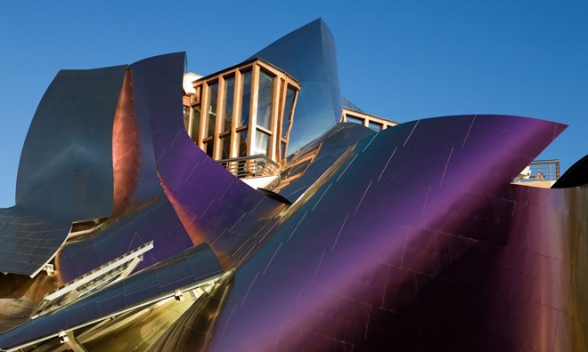 5. Marques de Riscal Phong cách kiến trúc phá cách và có đôi chút rời rạc của kiến trúc sư Frank Gehry là khó có thể nhầm lẫn, ví dụ như ở thiết kế của khách sạn Marques de Riscal vùng Rioja, Tây Ban Nha này. Trong đó, gam màu tím được sử dụng trên mái là chủ định gợi nhớ cho du khách về những khu vườn trồng đầy nho xung quanh khách sạn. |
