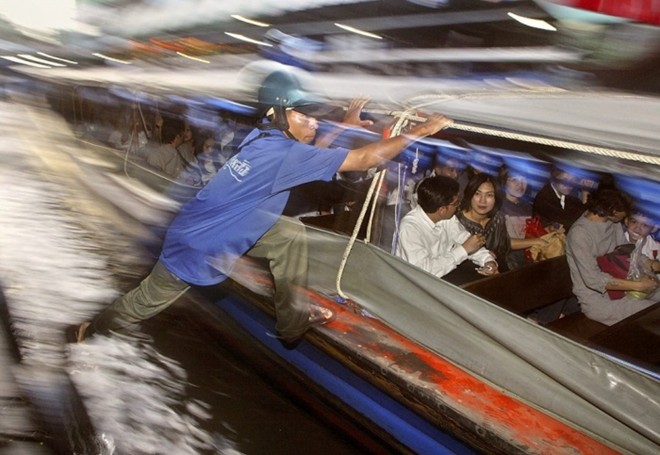Người thu vé nhảy lên một con thuyền máy trên kênh Khlong Saen Saep ở Bangkok, Thái Lan.