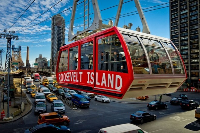 Đường tàu điện đảo Roosevelt của New York chạy trên sông Đông, nối hòn đảo với Manhattan.