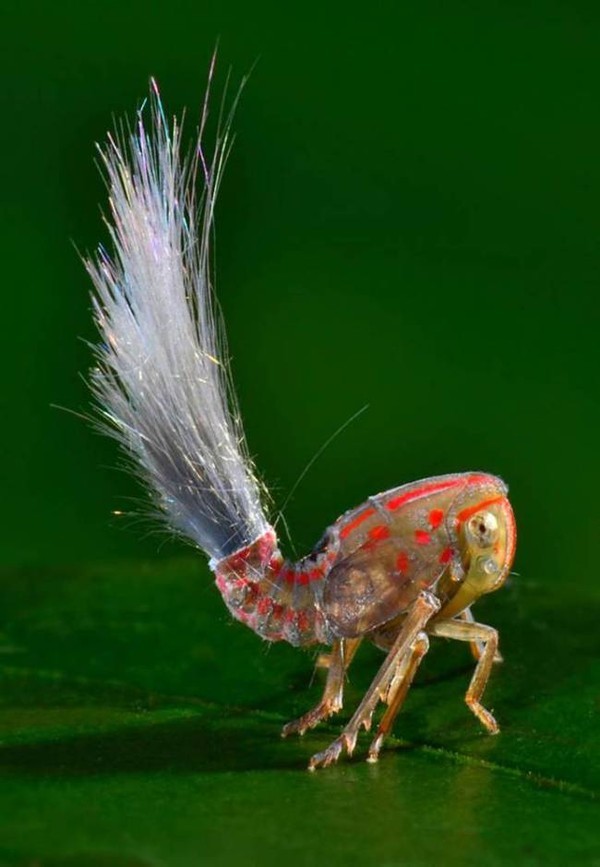 | Trong chuyến khảo sát gần đây tại rừng nhiệt đới Nam Mỹ, các nhà khoa học phát hiện một loài côn trùng có hình dáng kỳ lạ với chùm lông mọc ngược và dựng đứng phía sau. Sinh vật lạ có thân hình màu vàng đốm cam này chỉ dài 7 mm. Phần đuôi của nó có một chùm râu màu bạc, mọc ngược lên như mái tóc "điện giật" của búp bê Troll nổi tiếng thế giới vào những năm 1990. Dựa vào hình dáng và đặc tính sinh hoạt, các nhà khoa học cho rằng, sinh vật này có mối quan hệ họ hàng gần với loài nhộng. Ảnh: MSN |
