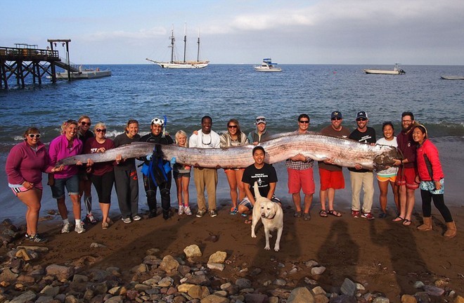 | Ngày 13/10, một con cá mái chèo dài 5,5 m trôi dạt lên bờ biển nam California, Mỹ. Con cá này dài đến mức cần 15 người trưởng thành để nâng được nó. Cá mái chèo thuộc loài cá xương lớn nhất thế giới. Chúng dài tới 15 m, nặng khoảng 270 kg khi trưởng thành. Chúng sống sâu dưới đại dương (độ sâu từ 200 m đến 1.000 m) nên người ta thường khó phát hiện. Ảnh: Catalina Island Marine Institute |