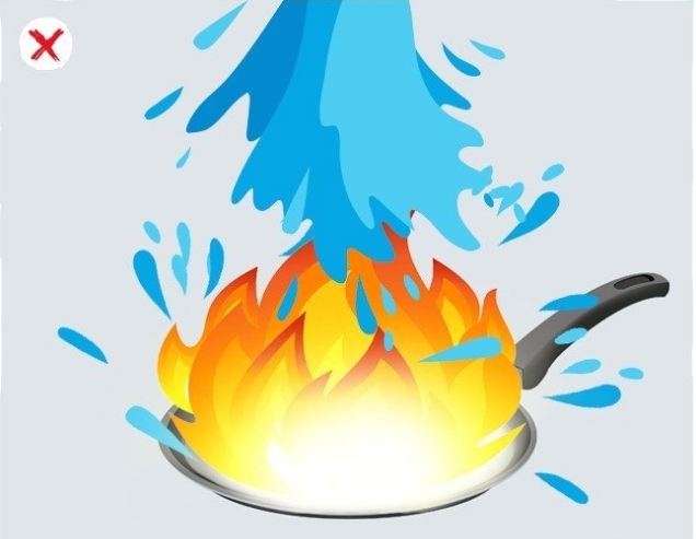 Khi dầu đang sôi trên bếp bốc cháy, rất nhiều người đã dùng nước đổ vào nồi, chảo để dập lửa. Đây là một sai lầm chết người vì sẽ khiến ngọn lửa bốc cháy cao hơn và còn có thể bắn vào người bạn.