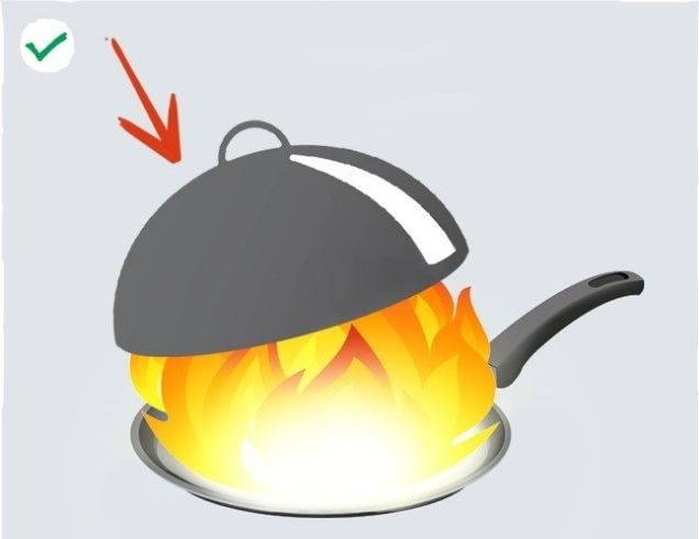 Cách xử lí đúng trong trường hợp này là cần cắt đứt nguồn cung cấp oxy cho ngọn lửa bằng cách tắt bếp và đậy vung lại. Trong trường hợp không có vung bạn có thể dùng 1 mảnh vải to và dày thay thế.