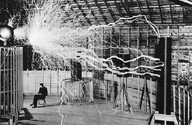 12. Nikola Tesla ngồi trong phòng thí nghiệm của ông với “Magnifying Transmitter".