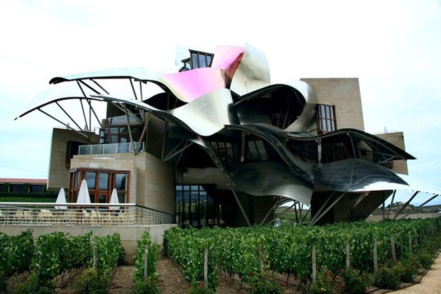 Khách sạn Marqués de Riscal, Elciego được thiết kế bởi kiến trúc sư Frank Gehry. Mở cửa vào năm 2006, khách sạn này mang phong cách riêng của kiến trúc sư tài ba Gehry với các tấm kim loại cong ôm bên ngoài và vô số đường zigzag.