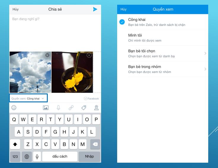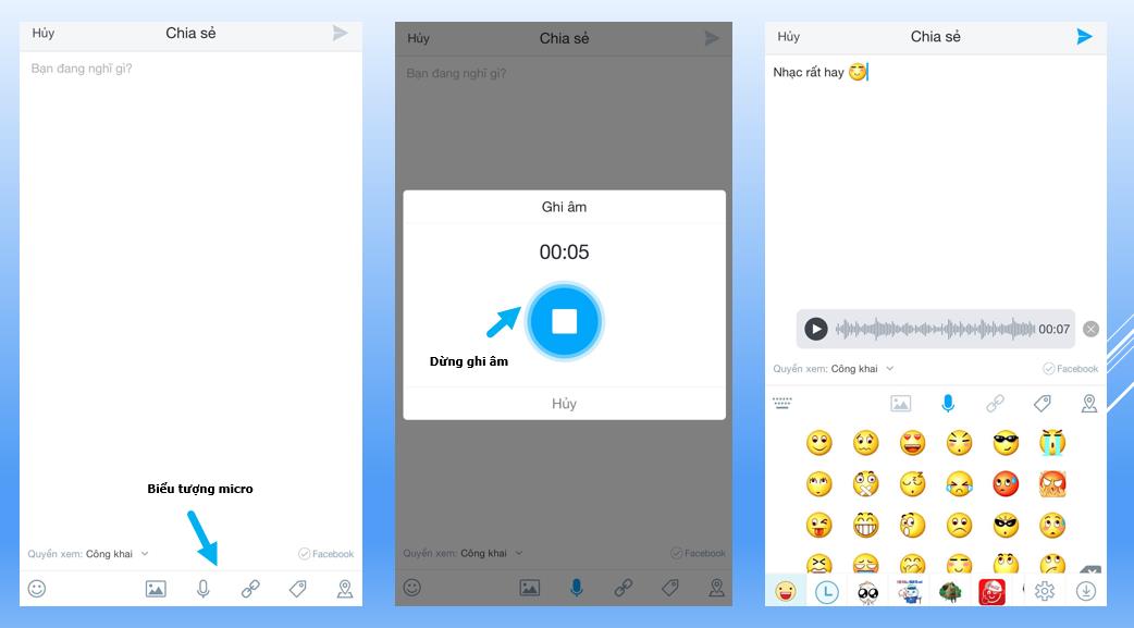 Điểm độc đáo của Zalo là cho phép người dùng chia sẻ trạng thái bằng âm thanh bên cạnh hình ảnh, văn bản, sticker... Bạn đang nghe một đoạn nhạc hay và muốn chia sẻ với bạn bè trên Zalo, chỉ cần chọn biểu tượng micro để bắt đầu ghi âm. Muốn dừng quá trình ghi âm, bạn nhấn vào biểu tượng ô vuông màu xanh. Nếu thích, bạn có thể gõ thêm vài dòng cảm nghĩ, chèn biểu tượng cảm xúc…