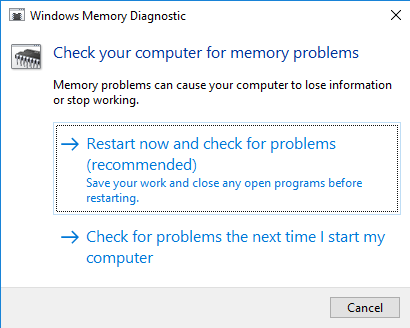 Windows có một bộ kiểm tra bộ nhớ có sẵn. Ấn Windows + R, gõ mdsched, rồi Enter. Bạn sẽ được yêu cầu khởi động lại máy. Sau đó nó sẽ tự chạy một số test trước khi khởi động lại máy và trở lại desktop. Các vấn đề tìm được sẽ được hiển thị trên thanh thông báo ở Taskbar.