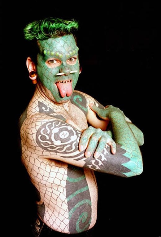 Eric Sprague, 37 tuổi, được mệnh danh là “Người thằn lằn” (The Lizardman), là một trong những người đàn ông đầu tiên trên thế giới có cái lưỡi chẻ đôi. Sprague đã phải chịu đau đớn suốt 700 giờ để xăm hình, cấy những hạt nhựa vào lông mày, mài răng, xuyên khuyên qua mũi và tai để có hình dáng không khác gì thằn lằn.