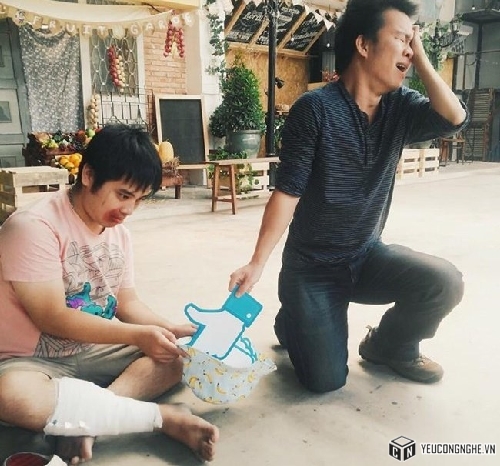 Trong ảnh, người xem nhận ra Dưa leo, cây hài độc thoại khá nổi trong giới trẻ, anh vào vai người đi phân phát những cái like, mang biểu cảm hài hước quen thuộc. Nhân vật còn lại là Đức Huy - cộng tác viên của một kênh giải trí dành cho giới trẻ, anh hóa trang thành chàng trai bị tai nạn gẫy chân, bầm mặt nhưng không quan tâm đến chỗ đau trên cơ thể, chỉ thích nhận những cái like.