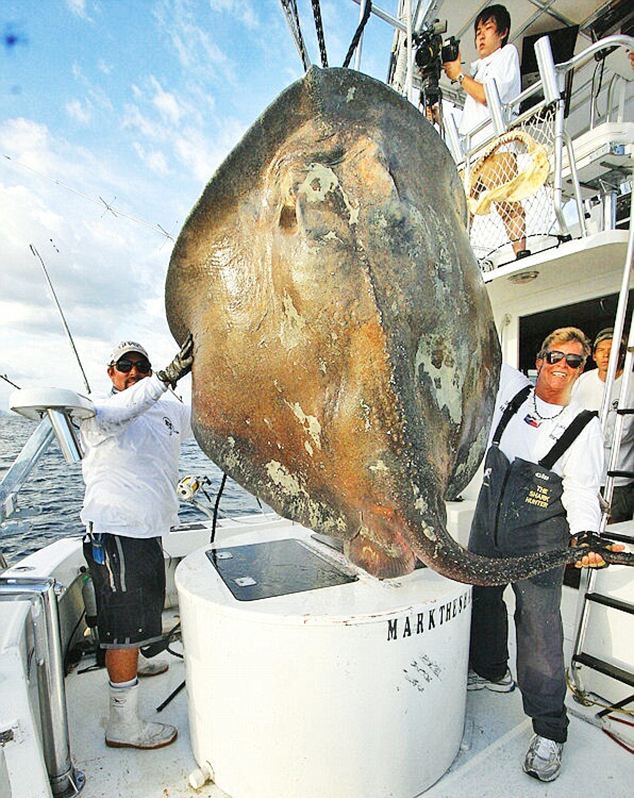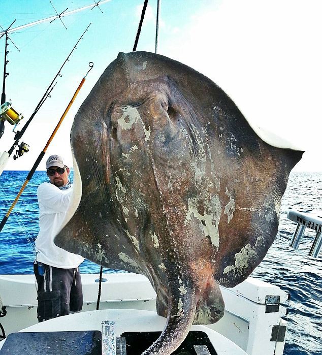 | Con cá thuộc họ cá đuối nhưng giống như khủng long. Thuyền trưởng Mark Quartiano bắt nó ở ngoài khơi bờ biển Miami (Mỹ) và đăng ảnh lên trang cá nhân hồi cuối tuần qua. Con quái vật có khối lượng 363 kg, chiều dài hơn 4 m. Ảnh: Mark Quartiano. |