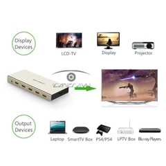 Bộ Gộp HDMI Hỗ chợ kết nối từ Đầu đĩa Blu-Ray, đầu DVD, máy thu TV, bộ thu AV, bộ thu Sky, máy tính xách tay, PC (máy tính), iTV, Apple Mac, Apple TV, Macbook, Máy tính bảng, Netbook, Máy tính xách tay, Playstation 3 (PS3), Xbox 360, Xbox One, Play Station 4 (PS4) ra chung 1 màn hình 4K.