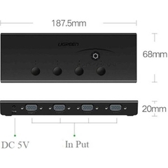Bộ gộp VGA 4 thiết bị vào 1 màn hình Ugreen 50279 hỗ trợ full HD băng thông 500Mhz kết nối từ các thiết bị được hỗ trợ cổng VGA như: máy tính, Macbook, Ps3, Tv box…sang 1 màn hình cho phép gộp 4 thiết bị hiển thị lên 1 màn hình và chọn nút chuyển đổi trên sản phẩm.